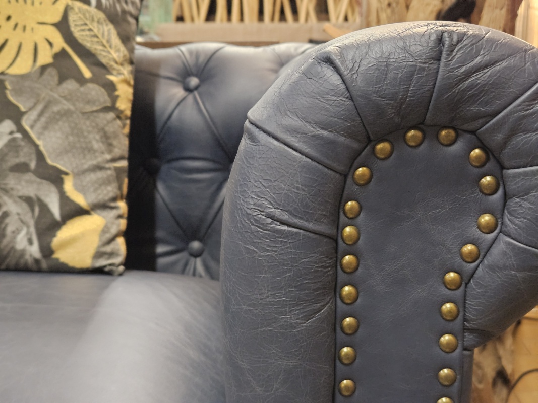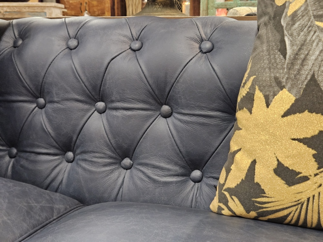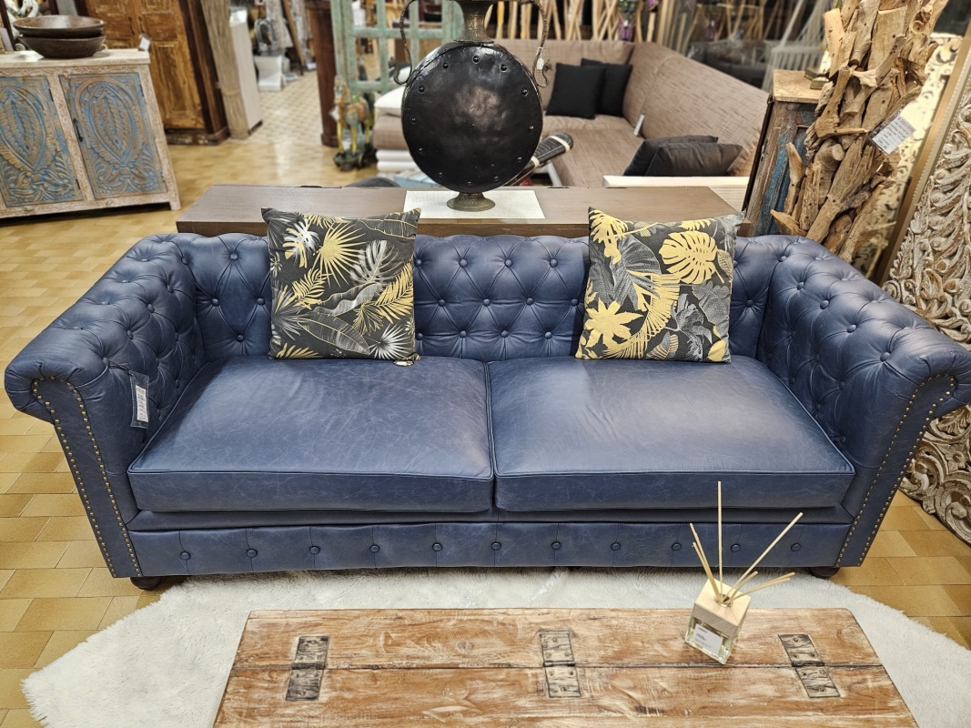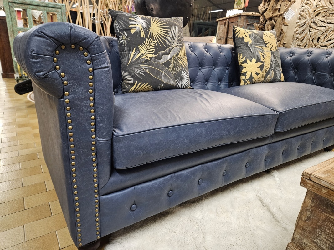 Divano CHESTER a 3 posti, in pelle colore blu, struttura interna in legno massello di mango, gamba in legno a cipolla
